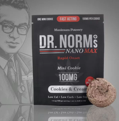 Experience Dr. Norm’s Fast-Acting Nano – our line of cannabis baked goods that have greater bioavailability than traditional edibles. This means faster acting as well as more potent! In fact, you may feel the onset of our Fast-Acting Nano products in as little as 15 minutes. We’ve also added back several minor cannabinoids like CBD, CBN and CBG which provide additional benefits via the entourage effect. Dr. Norm’s MAX 100 – Maximum Potency 100mg Cookies & Creme Nano is a modern mashup of an Oreo cookie and a traditional cookie. Packed with pieces of real Oreo cookies (we didn’t forget the “stuff” either!), this cookie bursts with unexpected flavor. Crunchy on the outside, moist and chewy on the inside – these cookies are so tasty, one bite and you are hooked! Ten 10mg Doses, packed into one delectable mini cookie! Only 6 calories, 0.3g fat, 0.8g carbs, 0.5g sugar per serving! Comes with a custom cutting grid for portioning into 10mg doses.