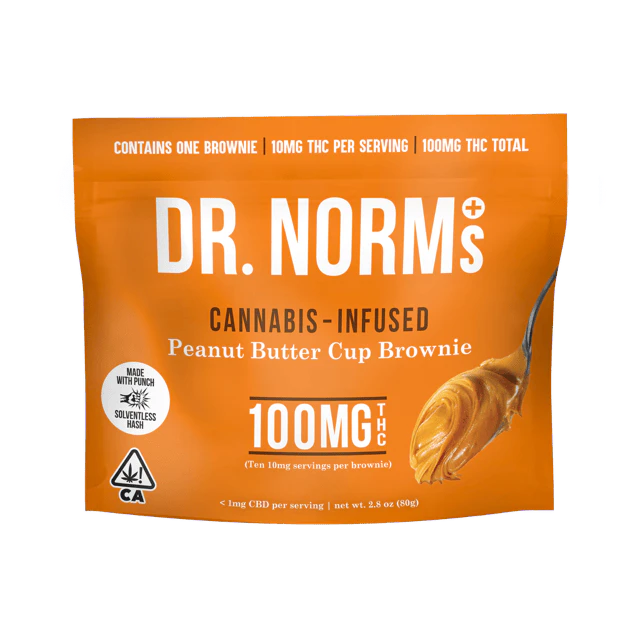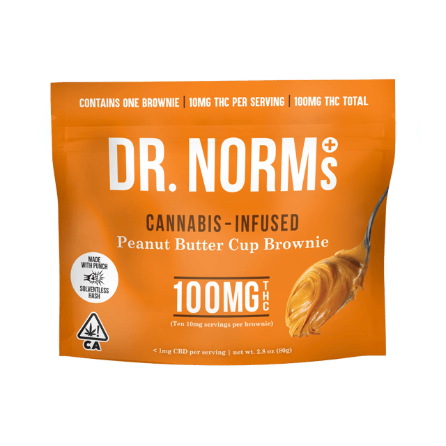Dr. Norm's Peanut Butter Solventless Hash Brownie is loaded with delicious peanut butter cups, peanut butter chips, and decadent chocolate! It is powered by Punch Extracts HASH and is the first solventless baked good in CA! It is great for low, medium, and high tolerance patients as it is a 100mg bar that comes with a dosing guide for how to cut into ten 10mg pieces.