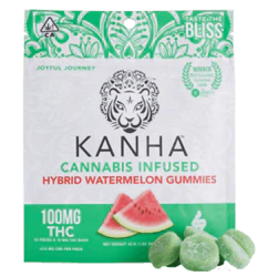 Kanha gummies are made with all-natural ingredients, coloring, and flavoring. Each gummy is infused with the highest quality cannabis oils to provide the most consistent, safe experience on the market. Our Watermelon gummies are refreshingly juicy and made with hybrid terpenes, which will put you somewhere in the middle of uplifted and relaxed. 10 pieces x 10mg/gummy = 100mg/bag