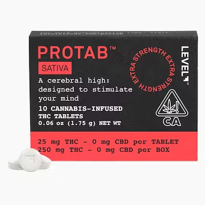Power through to-do lists and extra-long hikes with the energizing effects of our extra-strength Sativa Protab. Each swallowable tablet contains 25 mg of THC and takes effect in 30–90 minutes, with a duration of 2–4 hours. Should you want to consume a lighter dose, they’re scored so you can easily split one in half.