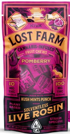 Get ready to elevate your chill game with Lost Farm's Pomberry Kush Mints Punch Live Rosin Fruit Chews! These delectable edibles are packed with a tantalizing blend of fruity flavors that will leave your taste buds dancing. Made with a carefully crafted terpene profile, these edibles allegedly offer a relaxing and potentially fun experience. Whether you're unwinding after a long day or simply seeking a little extra relaxation, these fruit chews are the perfect treat. Indulge in a unique and delicious way to kick back and enjoy some downtime with Lost Farm's Pomberry Kush Mints Punch Live Rosin Fruit Chews!