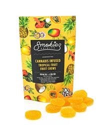 Smokiez Sour Tropical Fruit Chews are��NOT YOUR AVERAGE GUMMY These delicious fruit chews are a tasty and satisfying way for your customers to medicate! They are also Vegan, Gluten Free, Dairy-Free, and contain NO High Fructose Corn Syrup. Each of our mouth watering fruit chews contain 10 mg of THC, and made with our high clarity cannabis distillate for great taste. There are 10 pieces per package with 100 mg active THC per package. Smokiez Fruit Chews come in 5 delicious flavors and have both sweet and sour flavor profiles that your customers are sure to love!