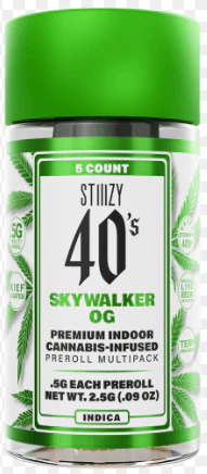 Stiiizy is setting the standard in the pre-roll game with the most revolutionary and innovative products. �� Elevate your pre-roll game. Stiiizy 40s pre-rolls are setting the standard with high potency, cannabis infused joints coated evenly with kief. Using our proprietary live resin infusion methods, we've designed every pre-roll to offer 40%+ THC potency with a unique flavor profile. With a smooth inhale and tasteful exhale, each and every Stiiizy 40 is packed with indoor grown flower, specifically made to ensure a potent and long-lasting high. Spark up the 40s. �� SKYWALKER OG / INDICA �� Taste: Earthy, Diesel �� Description: With its profound diesel and gassy aroma, Skywalker OG is known for its effects and flavorful aftertaste. With the extra kief coat on our 40s, Skywalker OG is sure to keep you feeling like you're floating in space. �� Feeling: Relaxed, Sleepy, Happy ��